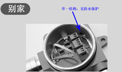 無單獨接線區(qū)域,需外加接線盒,成本增加,施工不方便。無防水處理,進(jìn)水后設(shè)備報廢。